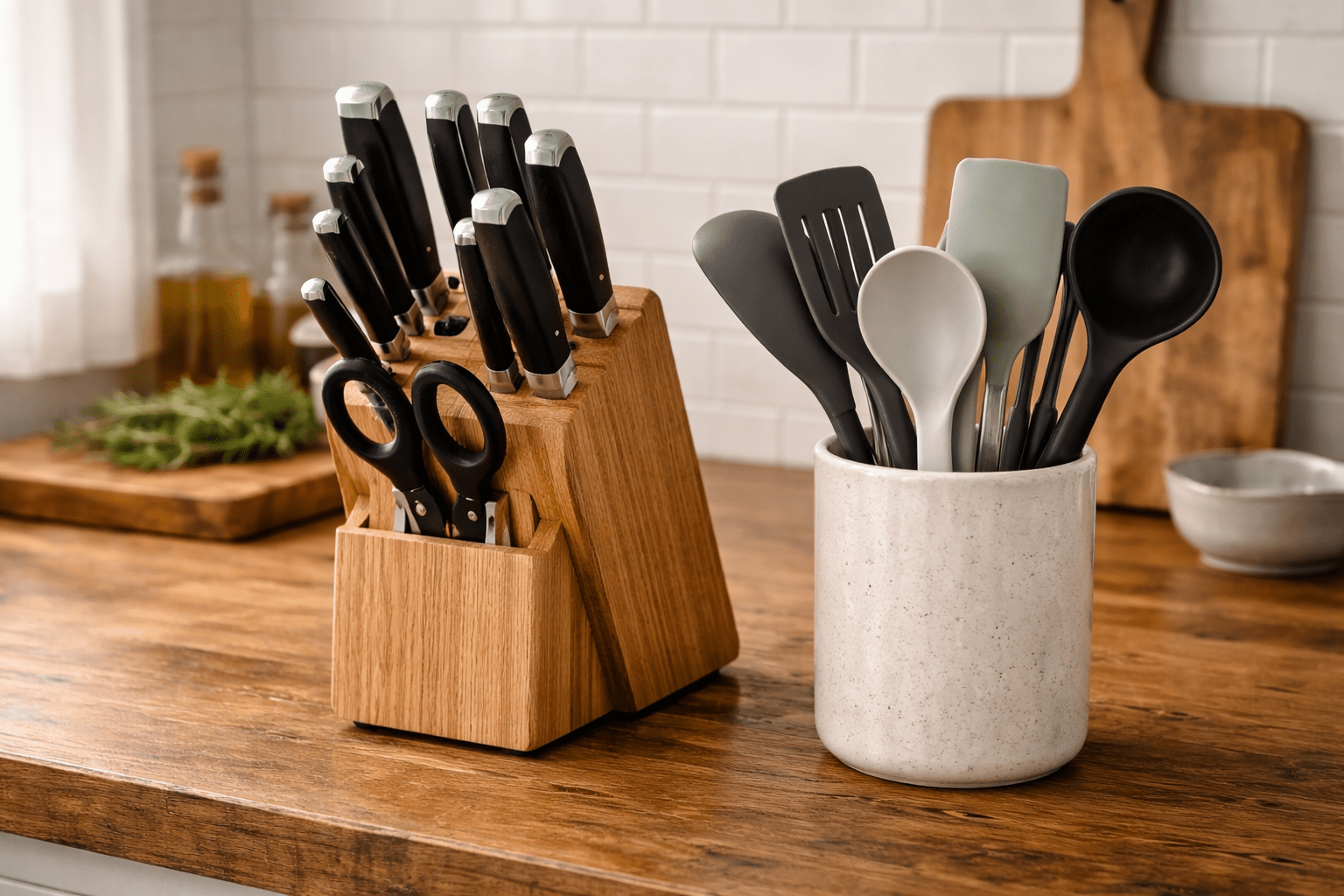 - A solid mid-range knife set is better than replacing dull bargain knives constantly.