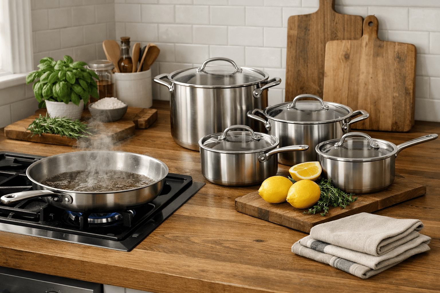 - Stainless steel lasts longer than lower-tier nonstick sets.