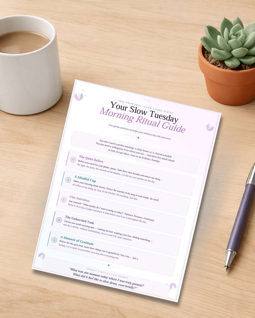 It’s called the Slow Tuesday Morning Ritual Guide- a free one-page printable with five gentle practices to bring more presence to your ordinary mornings, even when life isn’t cooperating.