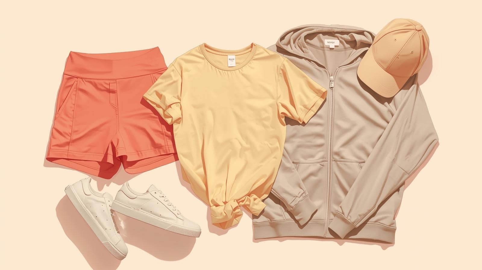 Bike shorts + oversized tee + zip-up hoodie + sneakers + baseball cap